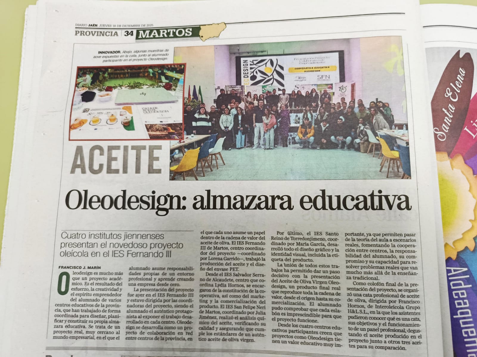 El IES Fernando III (Martos) va a coordinar el Proyecto Colaborativo de Emprendimiento en Formación Profesional para el alumnado que cursa grados D en centros docentes públicos de titularidad de la Junta de Andalucía, dentro del primer trimestre del curso 2025/2026. El proyecto, inspirado en la iniciativa “Almazara educativa OleoDesign”, se desarrollará con el IES Fernando III como centro coordinador y sede operativa de la recogida de aceituna, molturación y elaboración del aceite en una mini almazara industrial adaptada al centro, así como del diseño y fabricación aditiva (impresión 3D) del prototipo de botella.